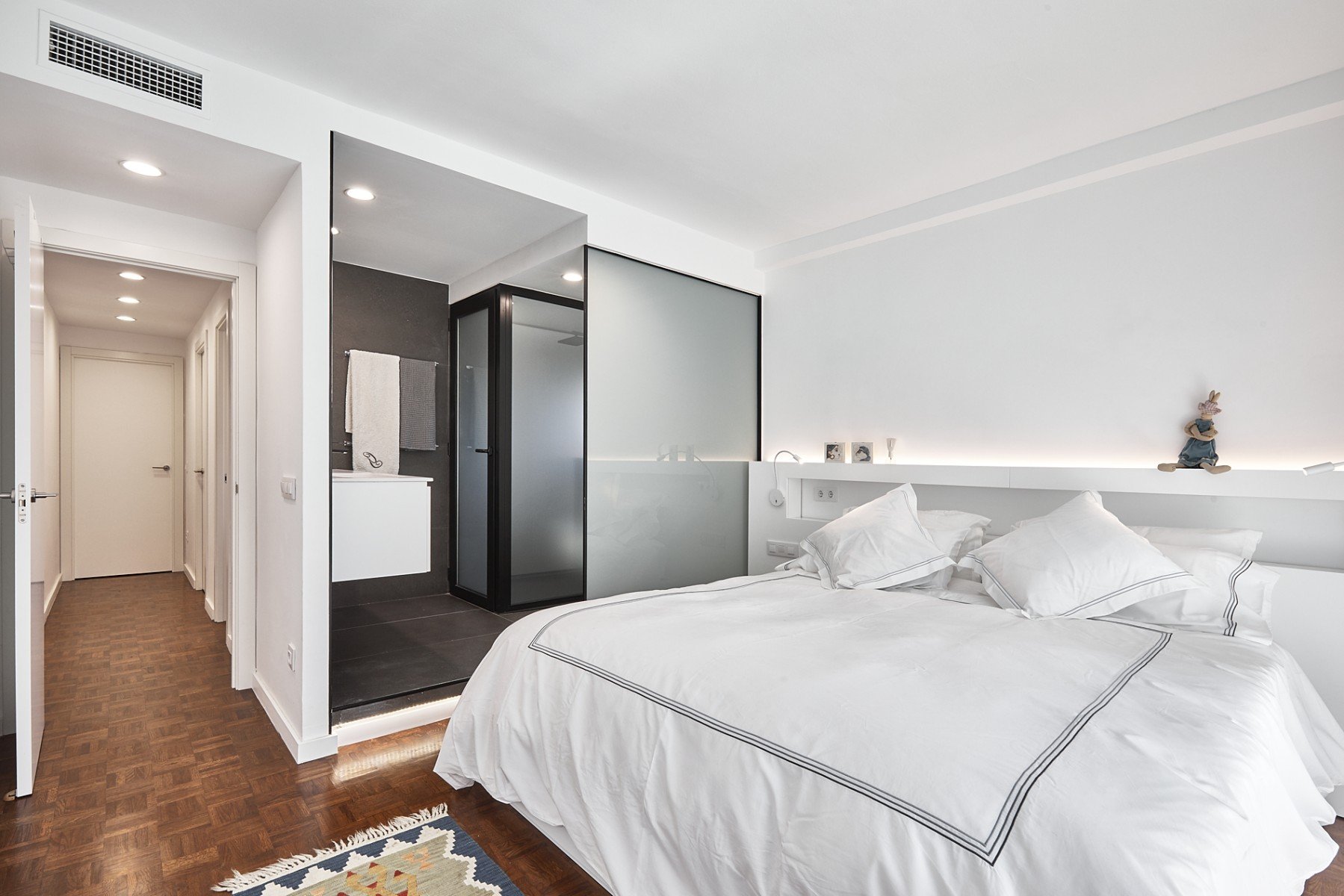 En la habitación principal domina el color blanco en las paredes y en la ropa de cama para dar sensación de pulcritud y amplitud en una estancia que no es excesivamente grande. La iluminación está integrada en el cabecero y en el suelo, lo que ayuda a crear una atmósfera más íntima. Pero también cuenta con una lámpara colgante de techo, del mismo estilo que la que hay en la cocina.
