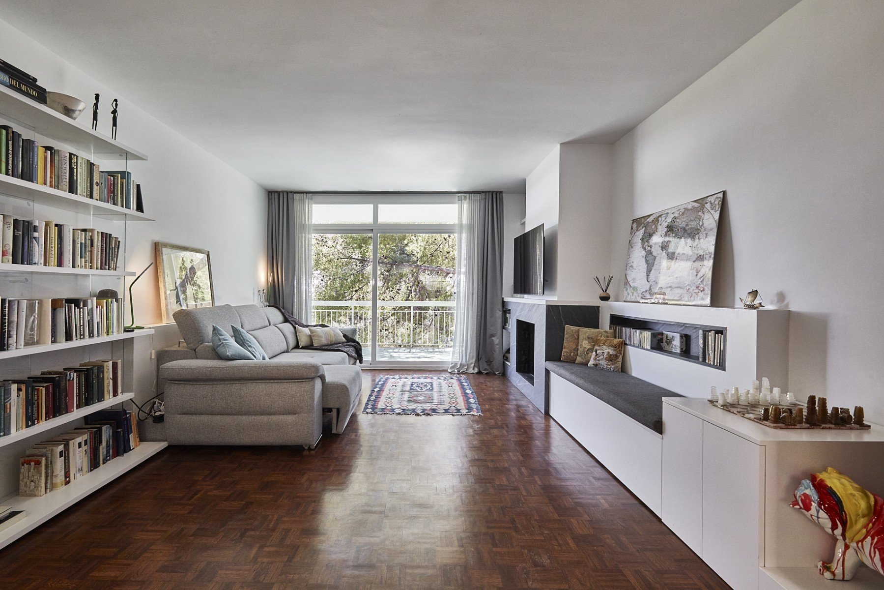 Al entrar en este apartamento lo primero con lo que nos encontramos es el salón, con paredes pintadas en blanco para crear una estancia muy luminosa y suelo de parquet. Frente al sofá tenemos una moderna chimenea de Neolith, de color negro con vetas blancas y el espacio que queda junto a ella se ha aprovechado a la perfección para crear una zona muy acogedora de lectura o para escuchar música