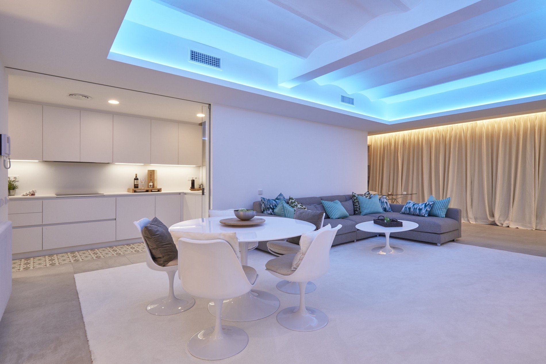Una característica a destacar en esta vivienda es que gran parte de la iluminación se integra en el mobiliario, como en el caso de la cocina, el baño o las habitaciones.