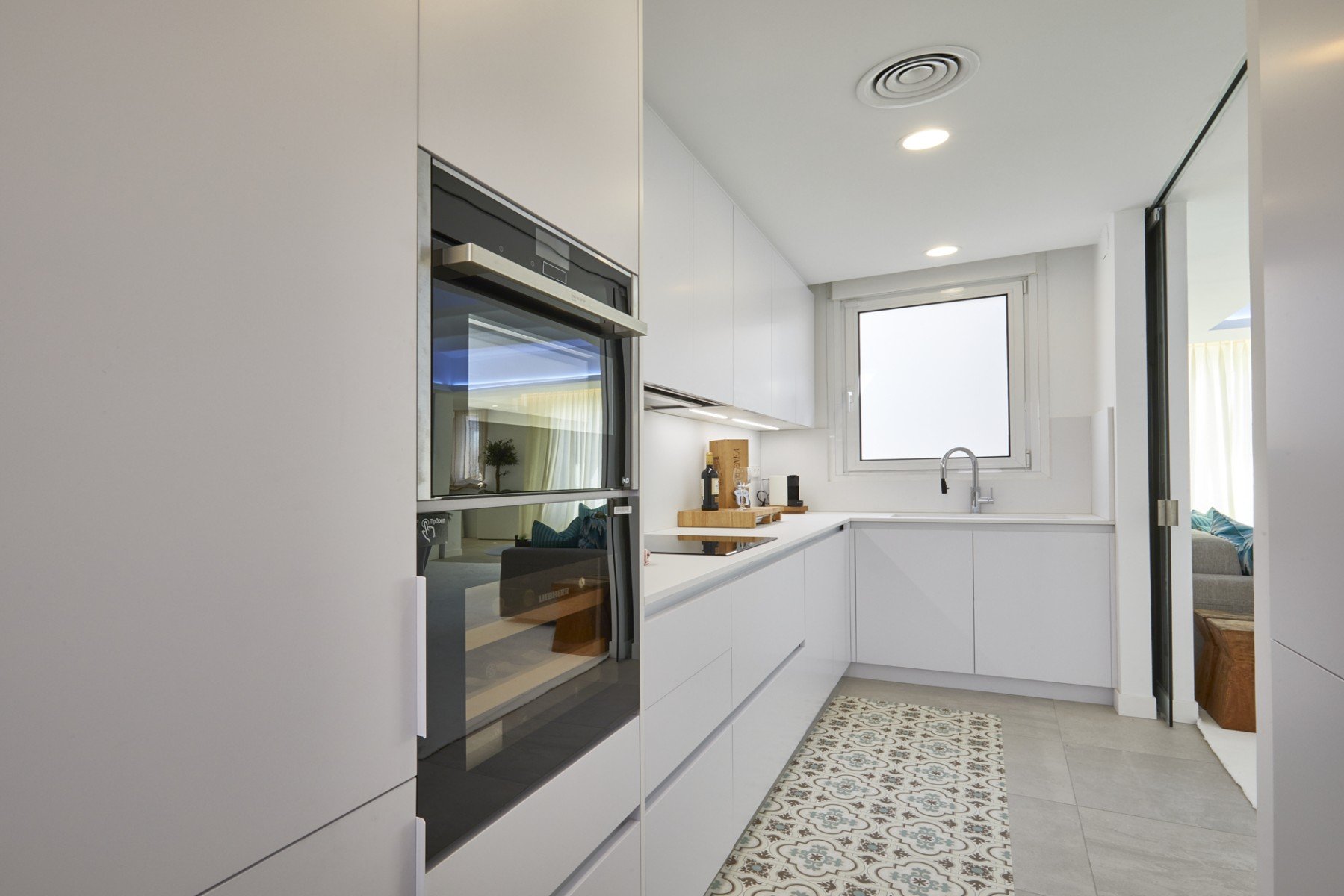 En la cocina hemos optado por un gris ártico para el suelo y, en este caso además, añadimos una zona de baldosas hidráulicas que da un toque clásico. Una puerta corredera separa el salón de la cocina, para así permitirnos elegir entre un espacio diáfano o dividir las estancias.