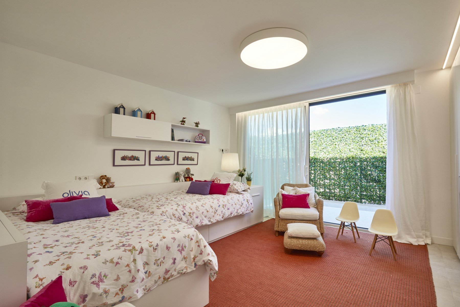 El mayor aporte de color lo da la habitación infantil, con objetos decorativos de diversos colores y juguetes que crean un ambiente muy alegre. La estancia cuenta con tres camas, dos distribuidas en L y una tercera situada de forma independiente, pero integrada en el mobiliario.