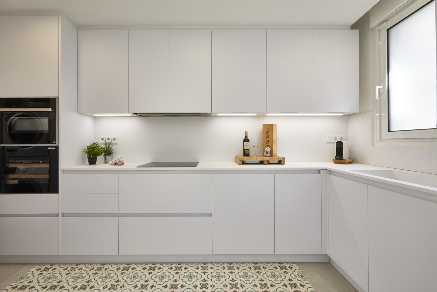 Tanto en este último caso, como en Alella House, optamos también por las baldosas hidráulicas, una buena opción para suelos y paredes, rememorando así las cocinas de nuestras abuelas. Y, si quieres cambiar cada cierto tiempo la decoración o tienes un presupuesto ajustado, podemos optar por los vinilos en las paredes, los cuales ofrecen múltiples diseños. Las paredes con los azulejos tipo fábrica o tipo metro en color blanco también son una buena alternativa.